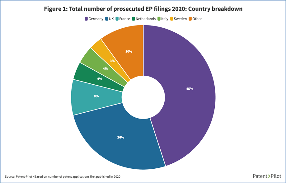 As highlighted in Patent-Pilot data*, some 170.245 patent applications were filed in 2020. In terms of the geographic areas, Germany and the UK led the way and accounted respectively for 45% and 26% of the European patent filings, followed by France totaling 8% and Italy accounting for 4%.
