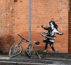 Recentissima pubblicazione, sul profilo Instagram di Bansky è quella di una bimba intenta a giocare all’hula-hoop con uno pneumatico da bicicletta su un muro esterno di Nottingham, Gran Bretagna.