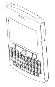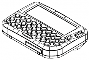 L’azienda deposita anche molti brevetti e design industriali per tutelare non solo la tecnologia, ma anche l’estetica dei propri dispositivi, come quello qui rappresentato relativo al BlackBerry “pager” (estratto dal sito EUIPO), un curioso cercapersone così chiamato per la disposizione dei tasti che ricorda l’omonimo frutto.