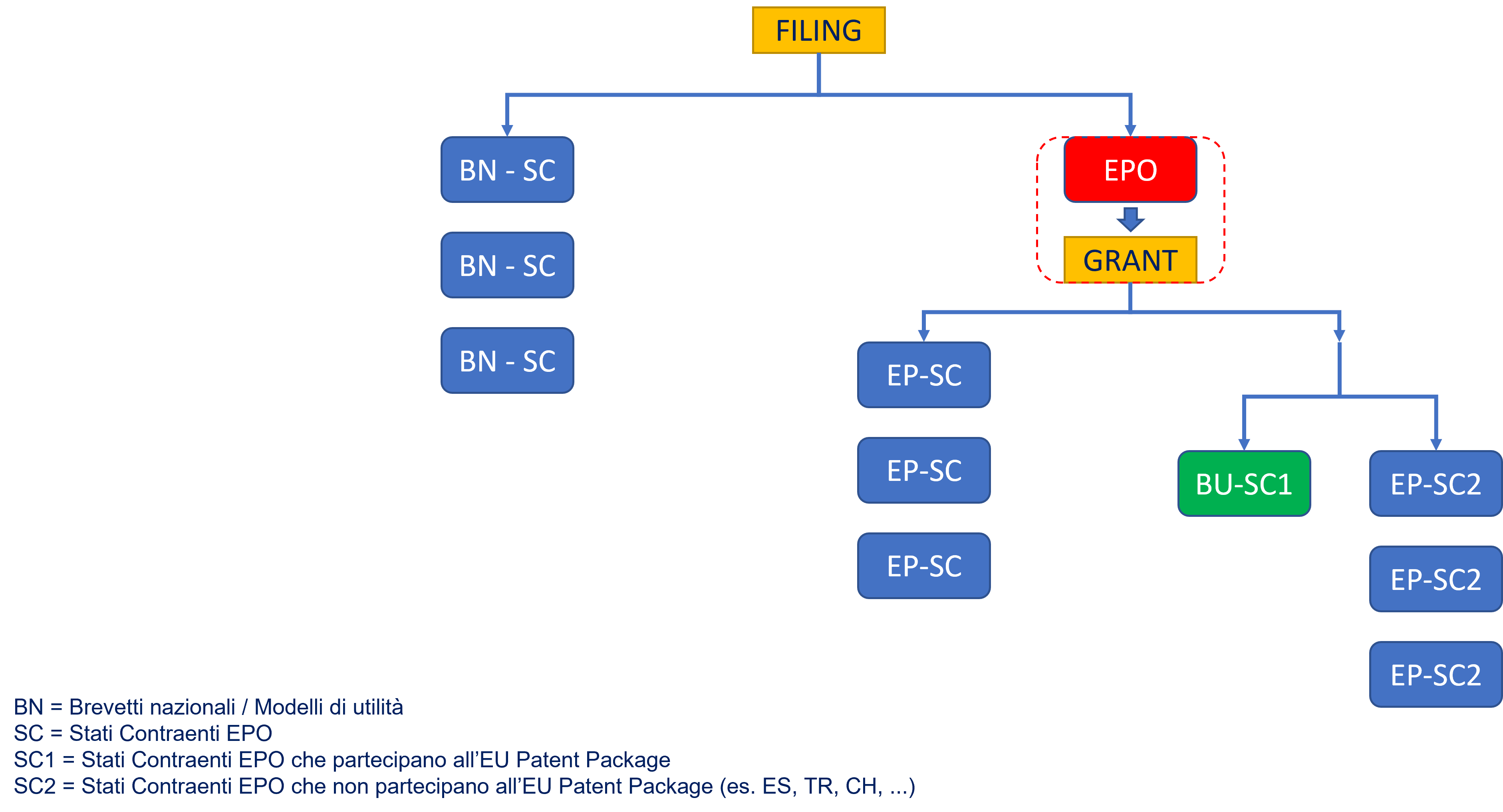 - la richiesta di “Effetto Unitario” che costituisce un titolo unico, noto anche come Brevetto Unitario (BU), per gli Stati Membri dell’UE che partecipano all’EU Patent Package (SC1), eventualmente affiancata alla convalida nazionale in ciascuno Stato di interesse scelto fra gli Stati che non partecipano all’EU Patent Package (SC2) perché non sono Membri dell’UE o perché l’EU Patent Package non si applica al loro territorio.