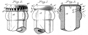 I primi brevetti sui tappi sono molto vecchi. Qui sotto si possono vedere le Figure 1-3 del brevetto statunitense US 468226, concesso in data 2 febbraio 1892, che – nella rivendicazione 1 – parlava di una “combinazione di una bottiglia avente una testa (A) comprendente una spalla anulare (b) adiacente al suo labbro (a) e una superficie (c’) diritta o inclinata al di sotto del recesso oltre la spalla, e di un tappo di tenuta (B) metallico contenente un disco di tenuta (C) e avente una flangia (d) che è piegata o corrugata in contatto bloccante con la spalla al di sopra del bordo della flangia, detto bordo essendo posizionato in posizione distanziata dalla superficie adiacente della testa della bottiglia per ottenere fra la porzione inferiore della flangia e la superficie adiacente della testa della bottiglia uno spazio anulare (e) accessibile ad uno strumento appuntito utilizzato per staccare il tappo”.