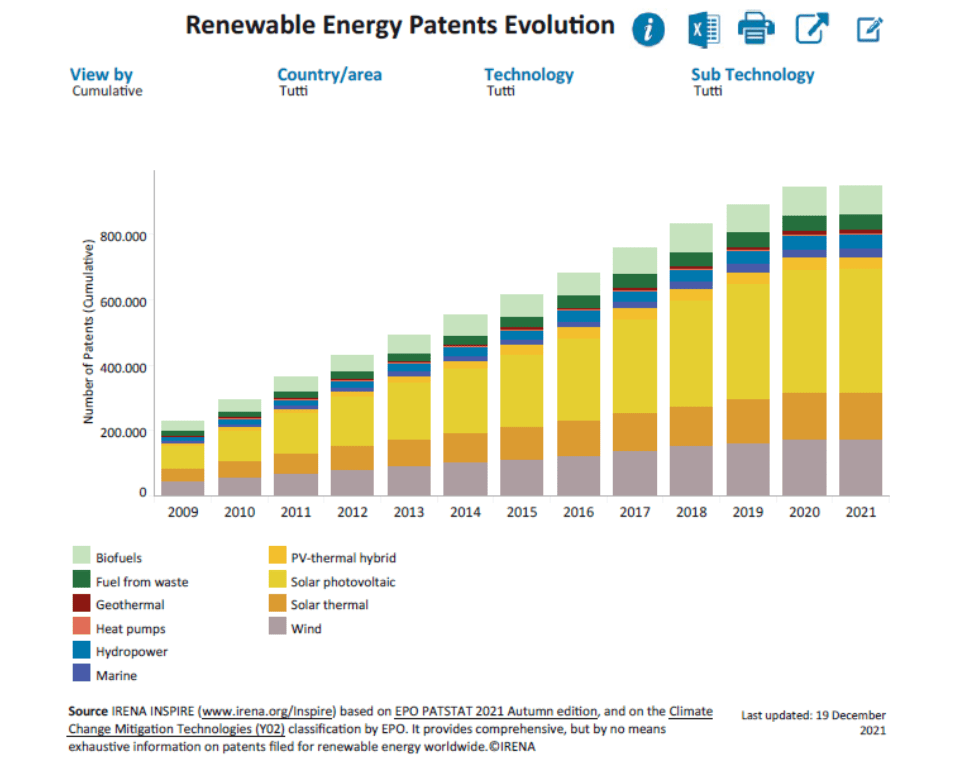 Non solo. Le statistiche brevettuali IRENA basate sui dati dell’EPO (European Patent Office), infatti, mostrano un incremento notevole anche sul fronte dei Brevetti, in particolare legati al fotovoltaico (nel 2021 379.181 brevetti/domande di brevetto totali), al solare termico (141.236 brevetti/domande di brevetto totali) e all’eolico (175.686 brevetti/domande di brevetto totali).
