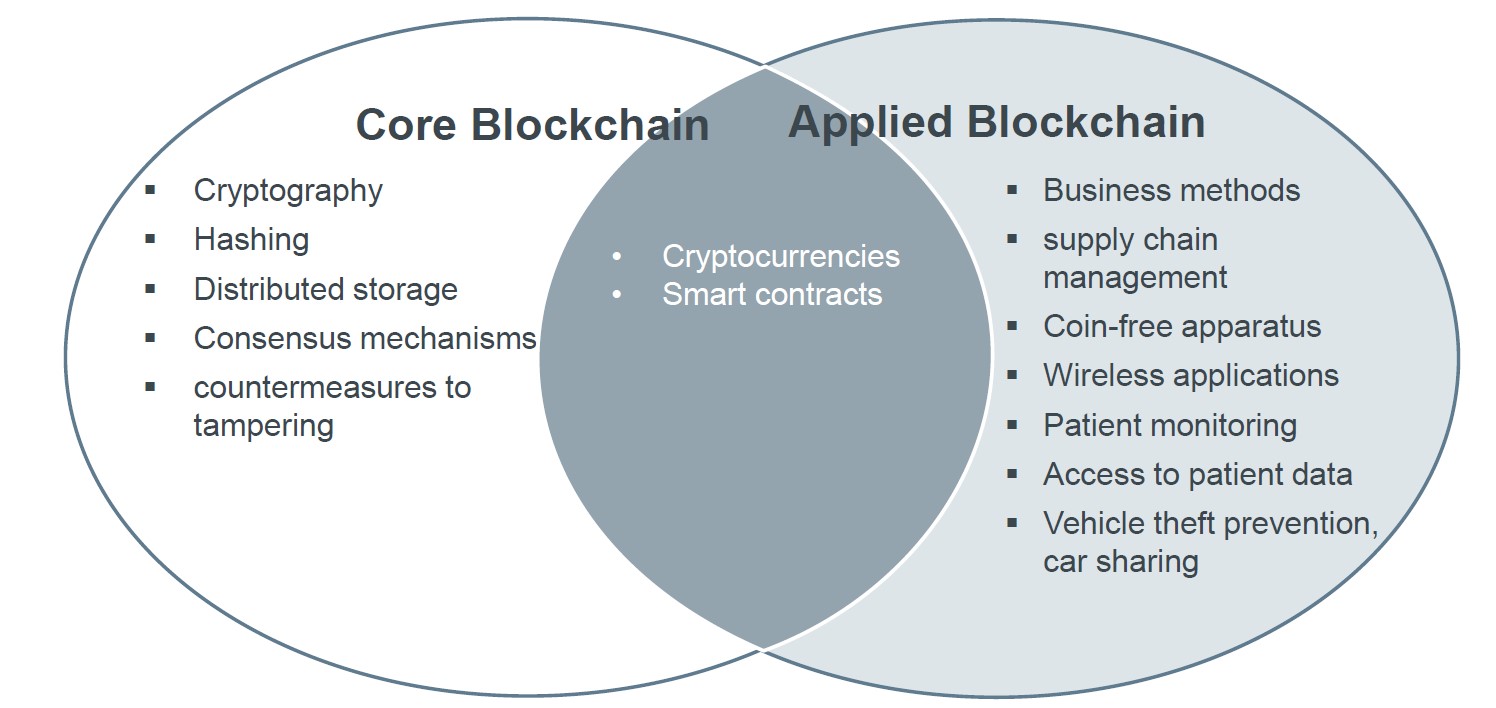 Innanzitutto, occorre fare un distinguo fra applicazioni “core blockchain” e “applied blockchain”. Le prime, sono applicazioni in cui l’innovazione risiede nella struttura e nei meccanismi di base della blockchain, mentre le seconde sono applicazioni in cui l’innovazione consiste nei processi / sistemi interfacciati con la blockchain.