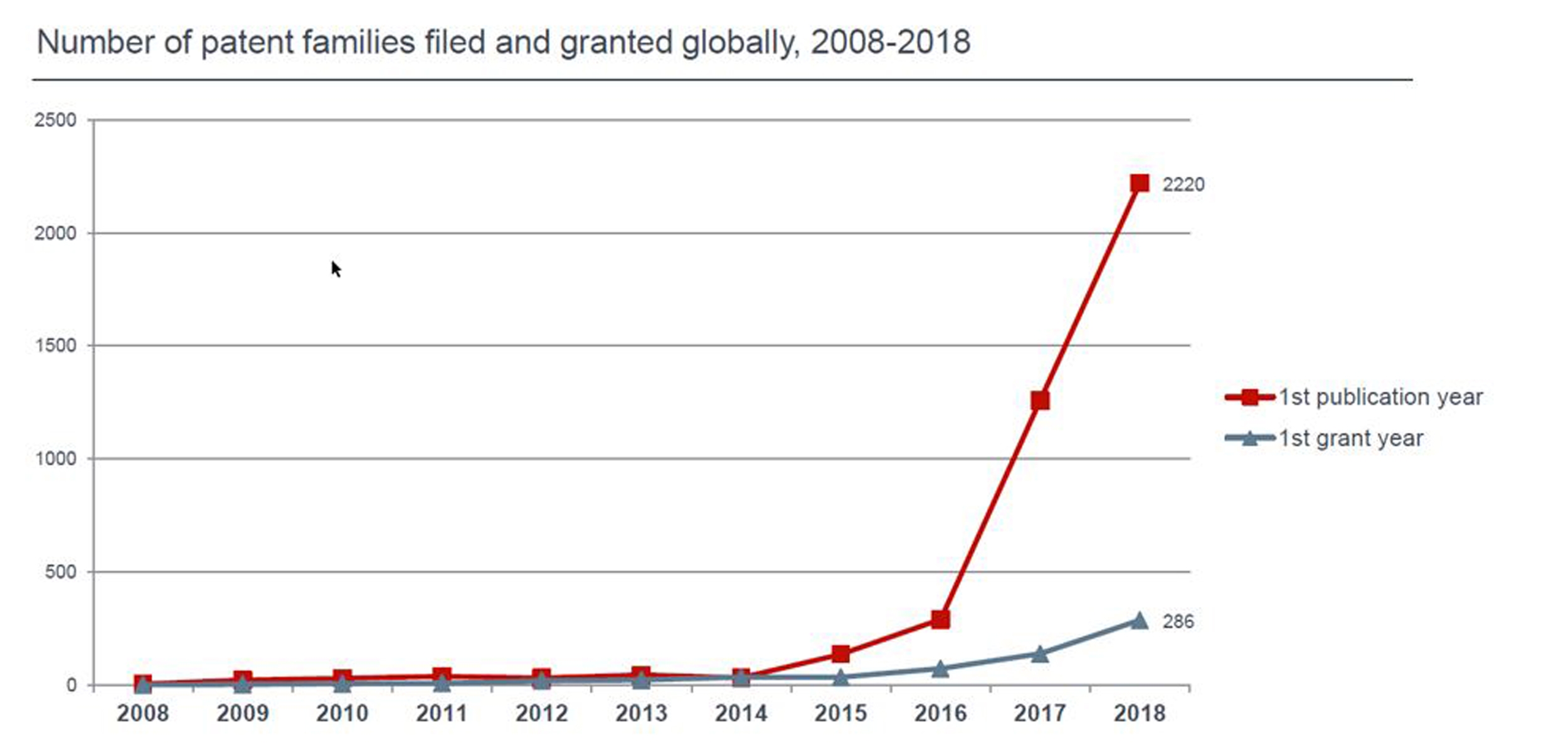 I dati presentati da Yann Ménière, Chief Economist dell’EPO, danno subito una idea del fenomeno: è evidente un aumento esponenziale a partire dal 2016 del numero di domande di brevetto depositate per tecnologie basate sulla blockchain.