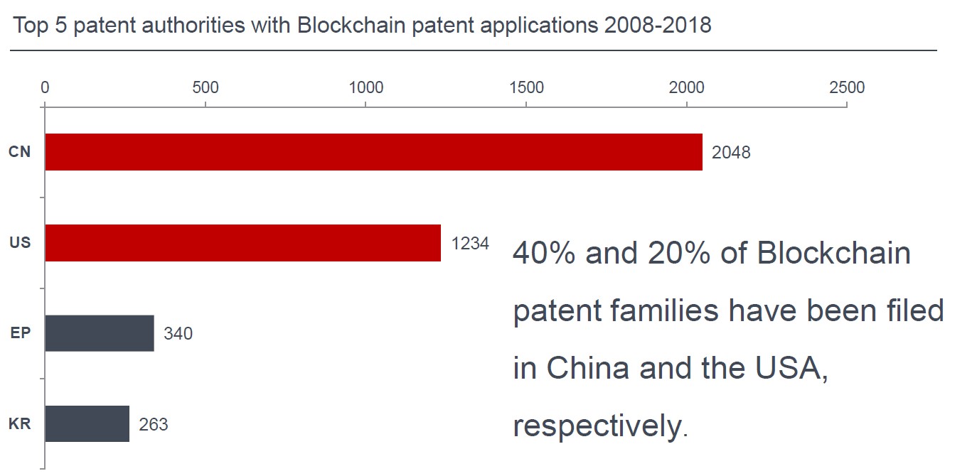 I paesi in cui vengono depositate più domande per le tecnologie basate sulla Blockchain sono Cina ed USA.