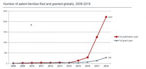 I dati presentati da Yann Ménière, Chief Economist dell’EPO, danno subito una idea del fenomeno: è evidente un aumento esponenziale a partire dal 2016 del numero di domande di brevetto depositate per tecnologie basate sulla blockchain.